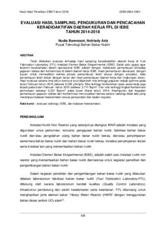 Nudia Barenzani and Nofriady Aziz (2018) EVALUASI HASIL SAMPLING, PENGUKURAN DAN PENCACAHAN KERADIOAKTIFAN DAERAH KERJA FFL DI IEBE TAHUN 2014-2018. Hasil-Hasil Penelitian EBN Tahun 2018, - (-). pp. 358-365. ISSN 0854-5561