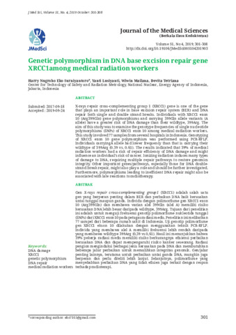 Harry Nugroho Eko, Surniyantoro and Yanti, Lusiyanti and Wiwin, Mailana and Devita, Tetriana (2019) Genetic polymorphism in DNA base excision repair gene XRCC1 among medical radiation workers. Journal of the Medical Sciences, 51 (4). pp. 301-308.