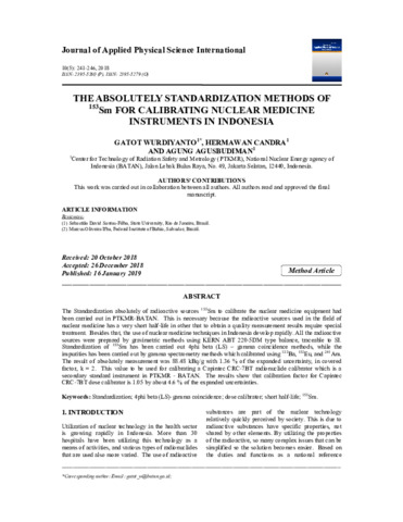 Gatot, Wurdiyanto and Hermawan, Candra and Agungagus, Budiman (2019) THE ABSOLUTELY STANDARDIZATION METHODS OF 153Sm FOR CALIBRATING NUCLEAR MEDICINE INSTRUMENTS IN INDONESIA. Journal of Applied Physical Science International, 10 (5). pp. 241-246. ISSN 2395-5260