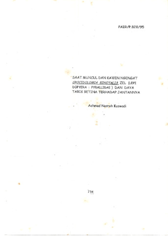 Kuswadi, Ahmad Nasroh (1995) Saat Muncul dan Kawin Ngengat Crocidolomia Binotalis Zel (Lepidoptera : Pyrallidae) dan Daya Tarik Betina Terhadap Jantannya. Technical Report. PAIR-BATAN, Jakarta.
