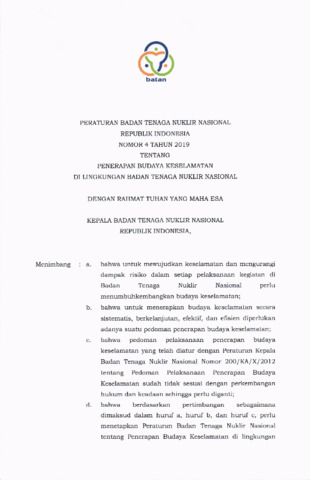 Berisi Peraturan tentang Penerapan budaya keselamatan di lingkungan Badan Tenaga Nuklir Nasional. Budaya keselamatan perlu ditumbuhkembangkan untuk mewujudkan keselamatan dan mengurangi dampak risiko dalam setiap pelaksanaan kegiatan di Badan Tenaga Nuklir Nasional. Penerapan budaya keselamatan secara sistematis, berkelanjutan, efektif, dan efisien perlu disesuaikan kembali dan dituangkan dalam Peraturan BATAN untuk mengatur pedoman penerapan budaya keselamatan. Dasar hukum Peraturan Kepala Badan Tenaga Nuklir Nasional ini adalah: UU No. 10 Tahun 1997, PERPRES No. 46 Tahun 2013, PERKA BATAN No. 14 Tahun 2013 sebagaimana telah diubah dengan PERKA BATAN No. 16 Tahun 2014, dan PERBATAN Nomor 3 Tahun 2018. Peraturan Badan Tenaga Nuklir Nasional ini ditetapkan pada tanggal 5 Juli 2019, dan mulai berlaku pada saat diundangkan tanggal 9 Juli 2019.