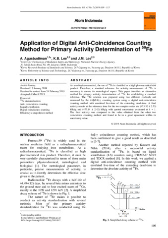 Agungagus, Budiman (2019) Application of Digital Anti-Coincidence Counting Method for Primary Activity Determination of 59Fe. Atom Indonesia, 45 (2). pp. 109-113. ISSN 0126-1568