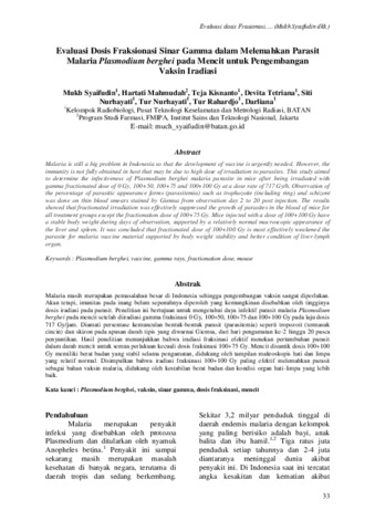 Mukh, Syaifudin and Teja, Kisnanto and Siti, Nurhayati and Tur, Rahardjo and Darlina, Darlina and Devita, Tetriana (2019) Evaluasi Dosis Fraksionasi Sinar Gamma dalam Melemahkan Parasit Malaria Plasmodium berghei pada Mencit untuk Pengembangan Vaksin Iradiasi. Jurnal Biotek Medisiana Indonesia, 8 (1). pp. 33-41. ISSN 2301-5810